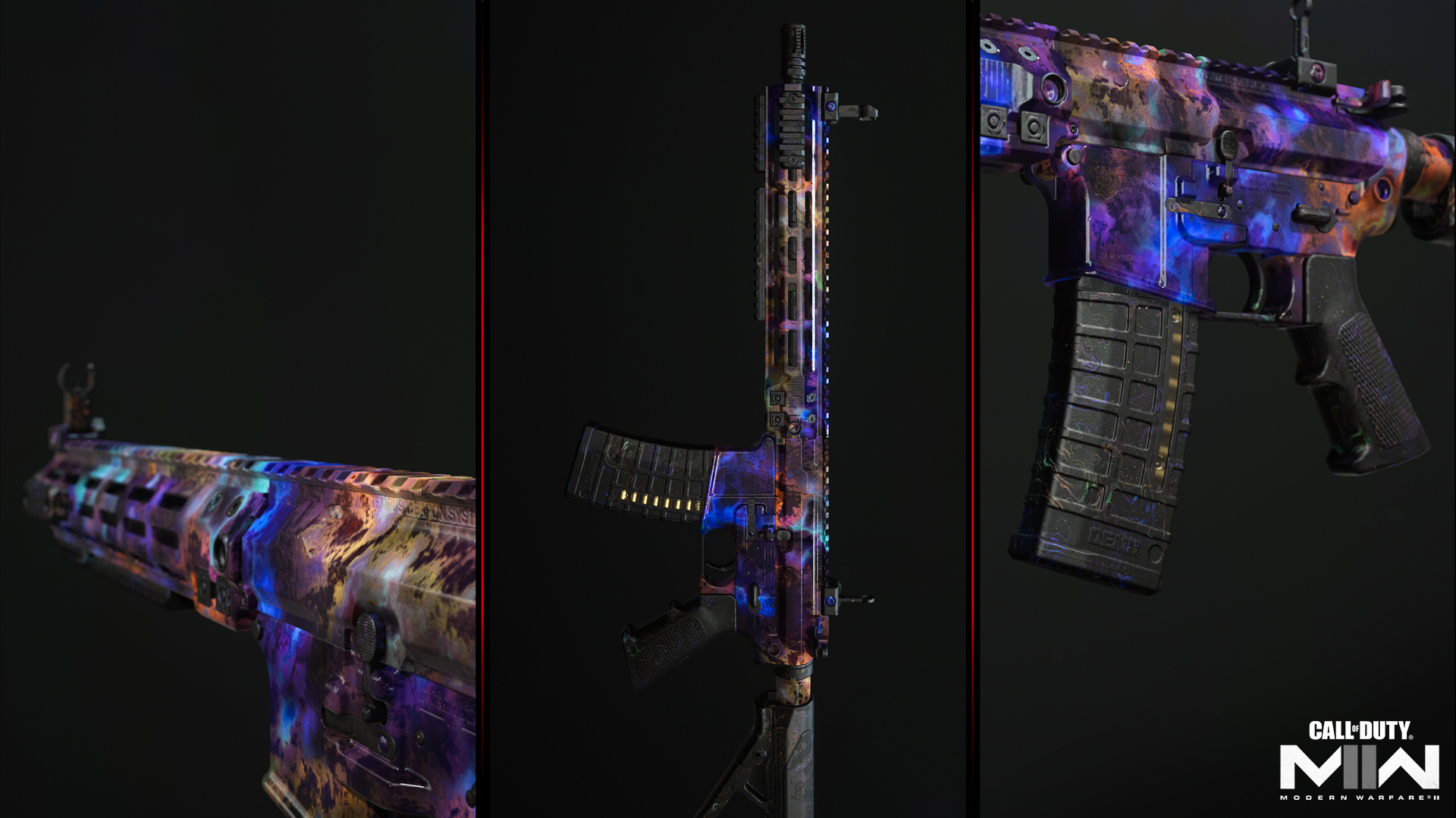 ملاحظة: تم تعيين MWIII لتتضمن مجموعتها الكبيرة من التمويهات، بما في ذلك تمويهات مكملي المهام (منفصلة عن التمويهات الذهبي والبلاتيني والبولياتوميك والأوريون في MWII أعلاه). لا يمكن ربح تمويهات MWIII هذه مقابل أسلحة.