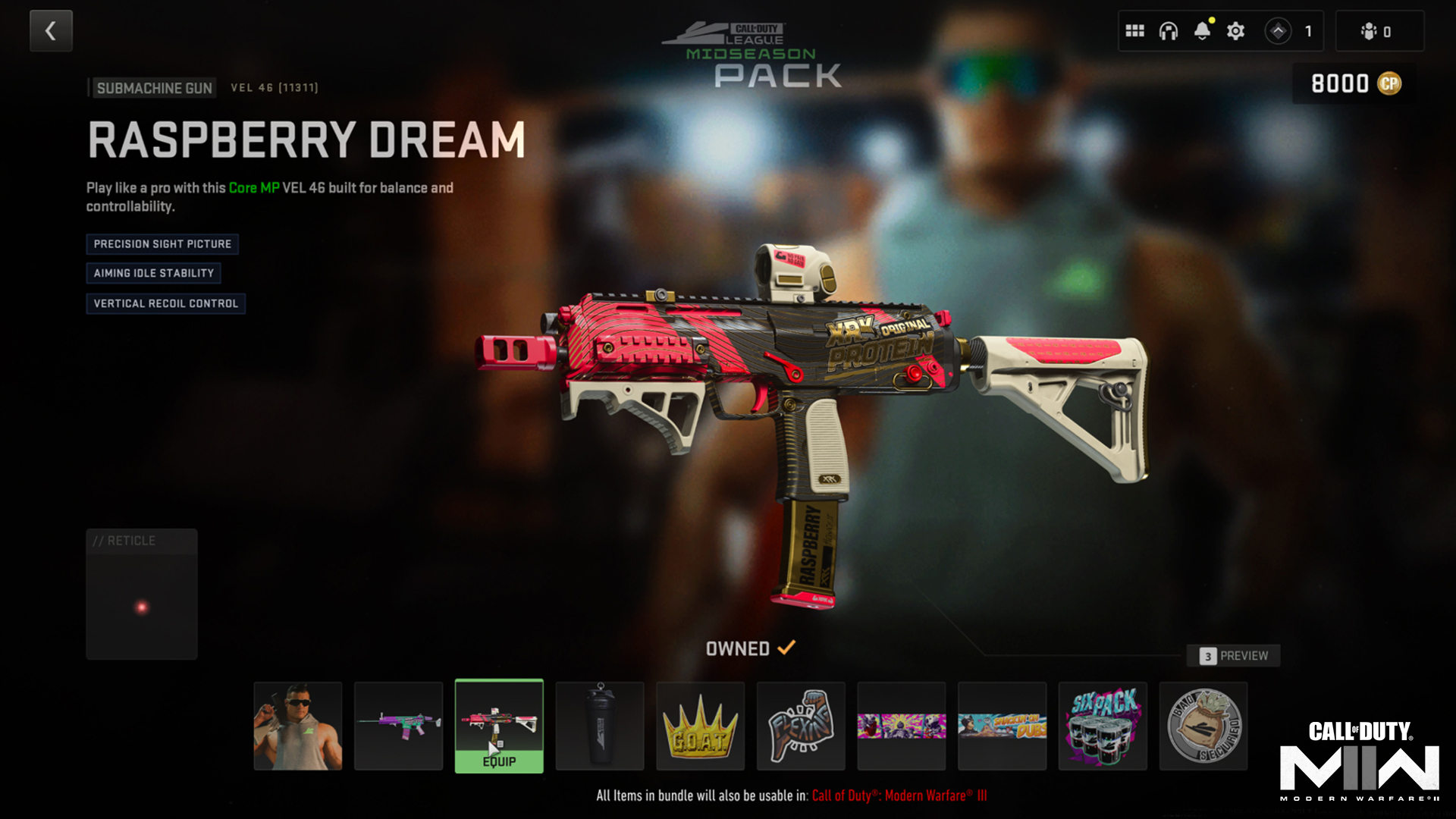 مثال: يقرر لاعب MWII شراء حزمة منتصف الموسم من Call of Duty League. عند فحص العناصر داخل الباقة، يوجد ملصق أسفل دائرة العناصر (كما هو موضح أعلاه) يؤكد أن جميع العناصر ستكون قابلة للاستخدام أيضًا في Modern Warfare III.